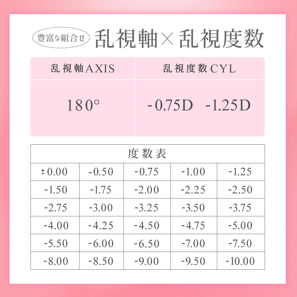 | 乱視度数(CYL/円柱度数) | -0.75D、-1.25D |