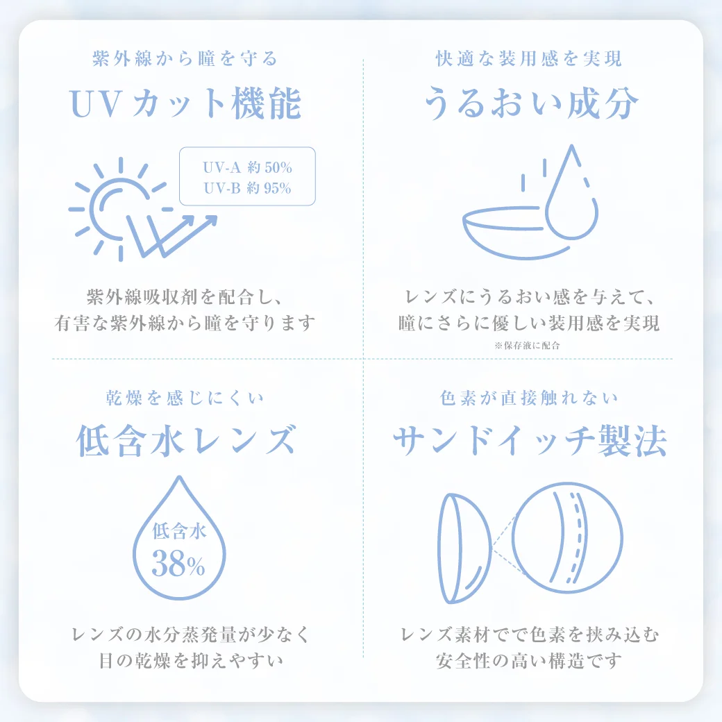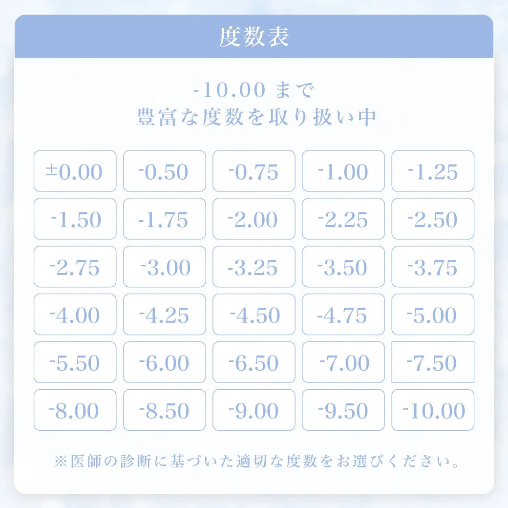 | 度数(PWR) | ±0.00D -0.50D~-5.00D(0.25Dステップ) -5.50D~-10.00D(0.50Dステップ) |