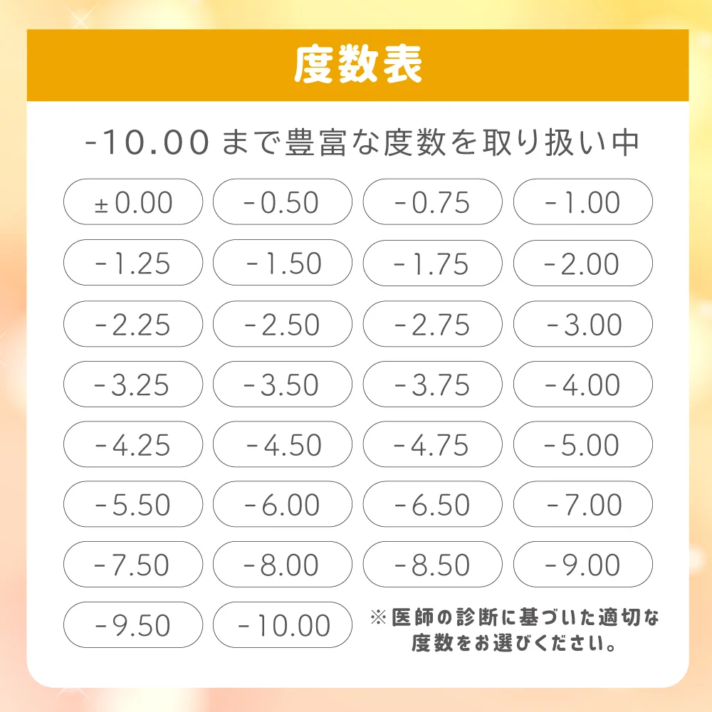| 度数(PWR) | ±0.00D -0.50D~-5.00D(0.25Dステップ) -5.00D~-10.00D(0.50Dステップ) |
